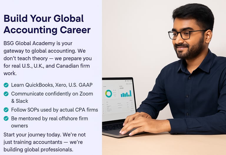 At BSG Global Academy, we empower ambitious accountants with real-world skills and global exposure, preparing them for successful careers in U.S., U.K., and Canadian CPA firms.